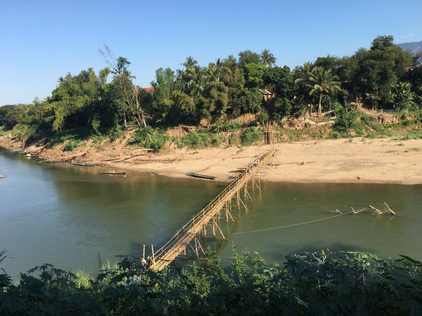 For the rest of the day we walked. We toured the old city that stretches into the peninsula between the Mekong and Nam Khan and took pictures of almost everything. We crossed a bamboo bridge and stuck our feet in the water on the other side.We watched as 3 Buddhist monks climbed the rocky Mekong shore across from us and jumped into the water in their bright orange cloths. We walked through parks and along the river promenade and fell in love with this beautifully exotic place.