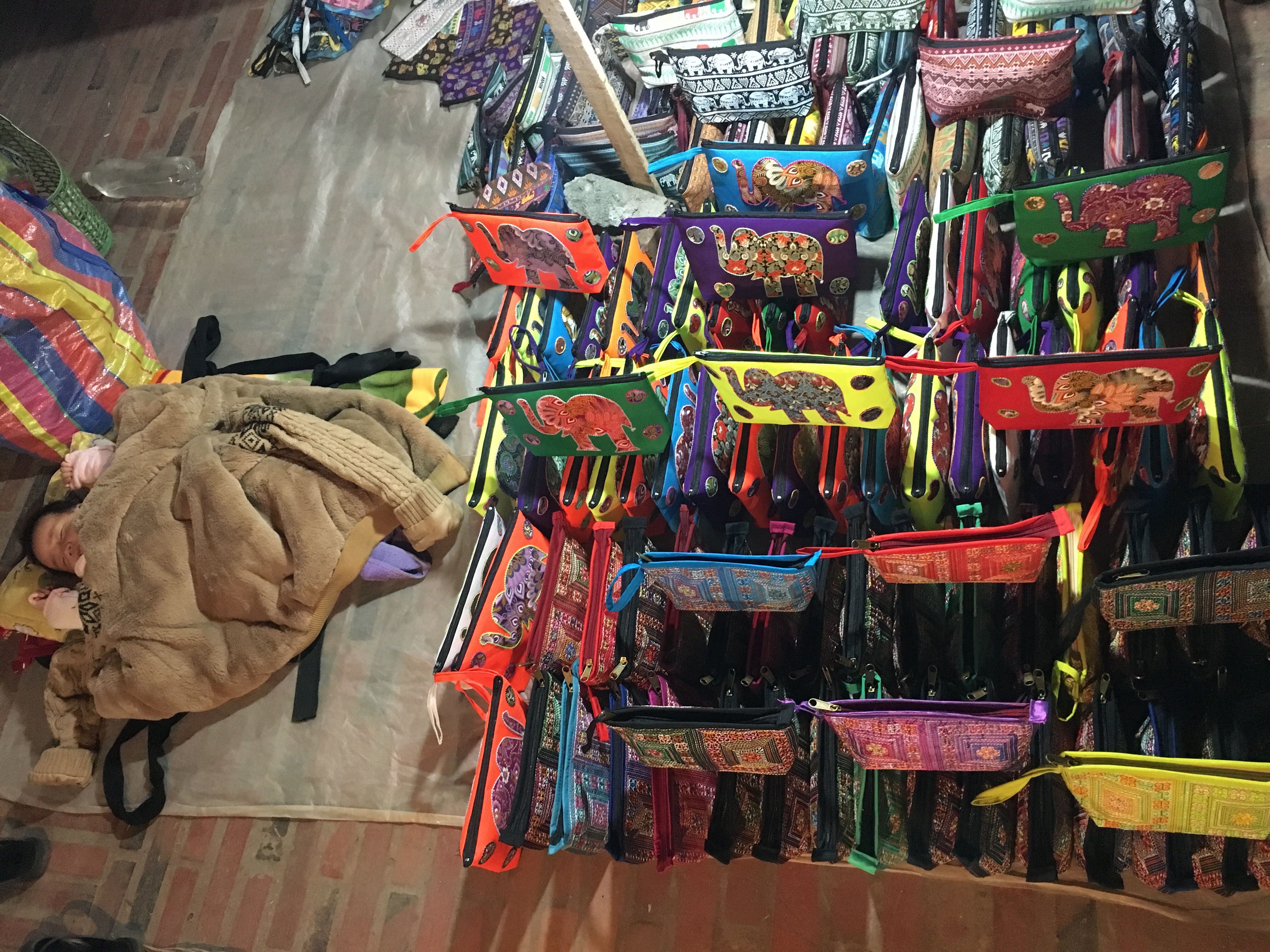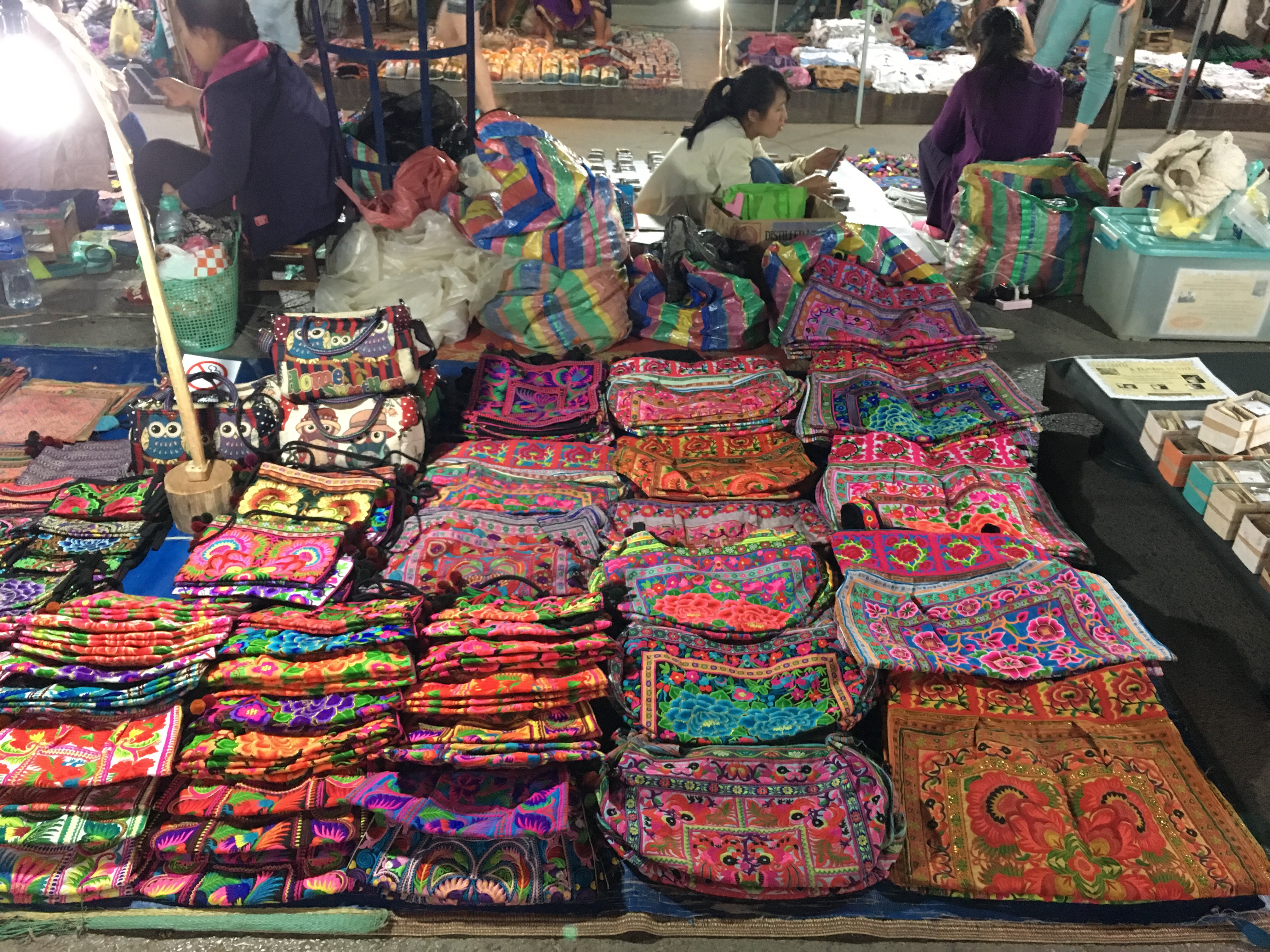 In the evening we visited the night market – there are worlds between the one in Vientiane and this one. Every evening around 5 PM one of the main roads in Luang Prabang closes and the street merchants bring out their products. For about 1km the street is filled with bright lights, silk scarves, dresses, jewelry, food, wooden carvings, lampshades in all colors, accessories, etc. The clientele is mostly made of tourists and you can hear all languages while walking through the market.