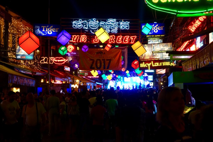 From Haven we walked into the bustling night market and ended up right on Pub Street. It’s like Oktoberfest in 30 degree heat. The street is filled with pubs (as suggested discretely by the name), cafes, street food stalls, fried- ice-cream stalls (that is a thing, yes), weird fried insects stalls, more bars, karaoke, AND A LIVE MUSIC STAGE. All surrounded by the night market. Coming from Luang Prabang we felt like we were dropped in the pits of hell. I exaggerate of course, but it was rather a culture shock. We decided that we will not return to Pub Street for the New Year celebration, as initially planned, because we are not insane. It was a good decision.