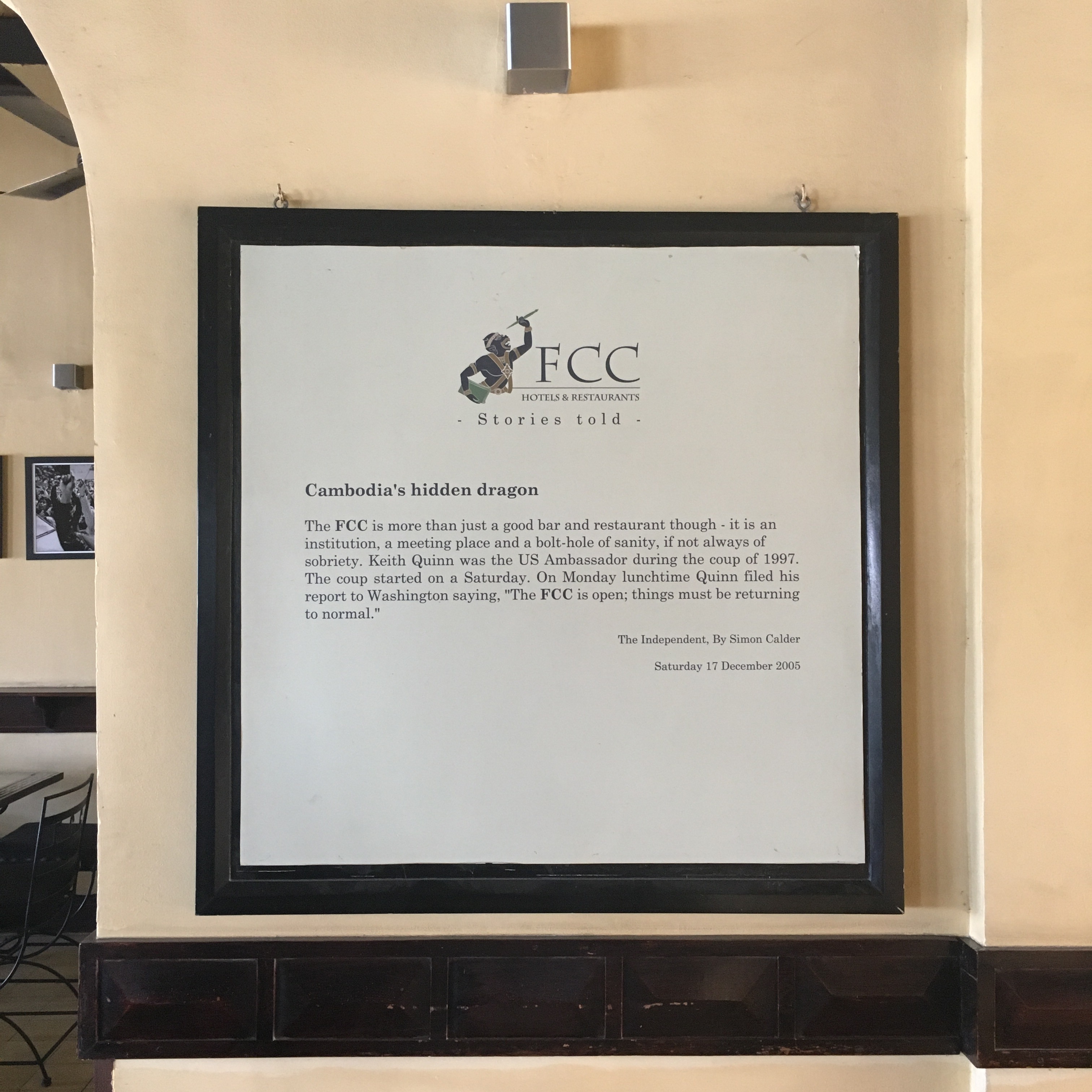 Me freshly covered from head to toe, we walked the same route back to find out the Palace only opens at 2PM. This was a great opportunity to check out the Foreign Correspondent´s Club at the riverside. This place – as the name suggests – was the meeting point for journalists and other foreigners in Phnom Penh, before the Khmer Rouge took over and afterwards as well. Today it is a regular bar with a wonderful view over the Mekong, it servers food and a plethora of cocktails, spirits and other drinks. Pictures and newspaper cutouts printed high scale cover the walls – a constant reminder of that gruesome era and its victims.